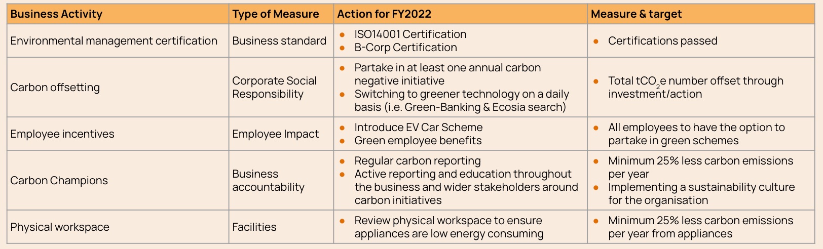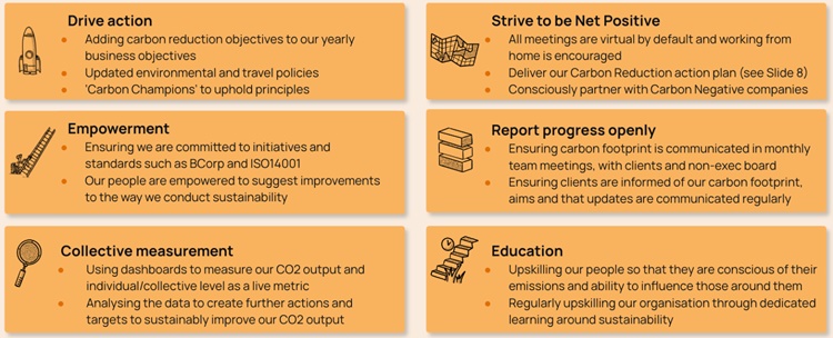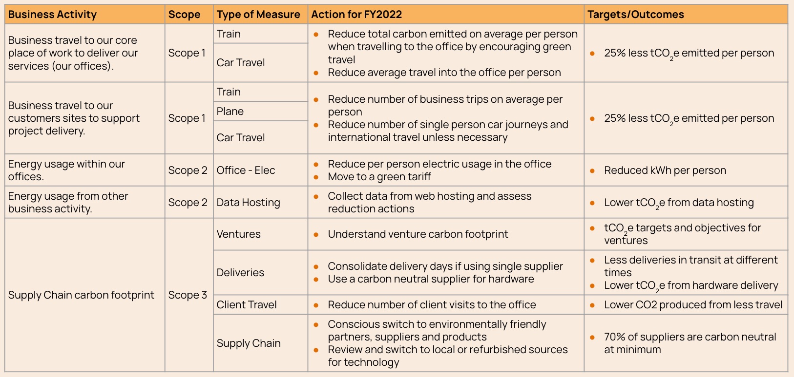 - Reducing travel to client sites where possible and agreeing contractual carbon reduction with clients; and