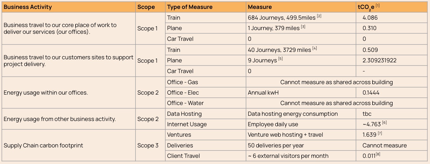 Against each of the scopes we then set our specific business activities that applied to our business and the specific measures we would aim to understand. These covered: